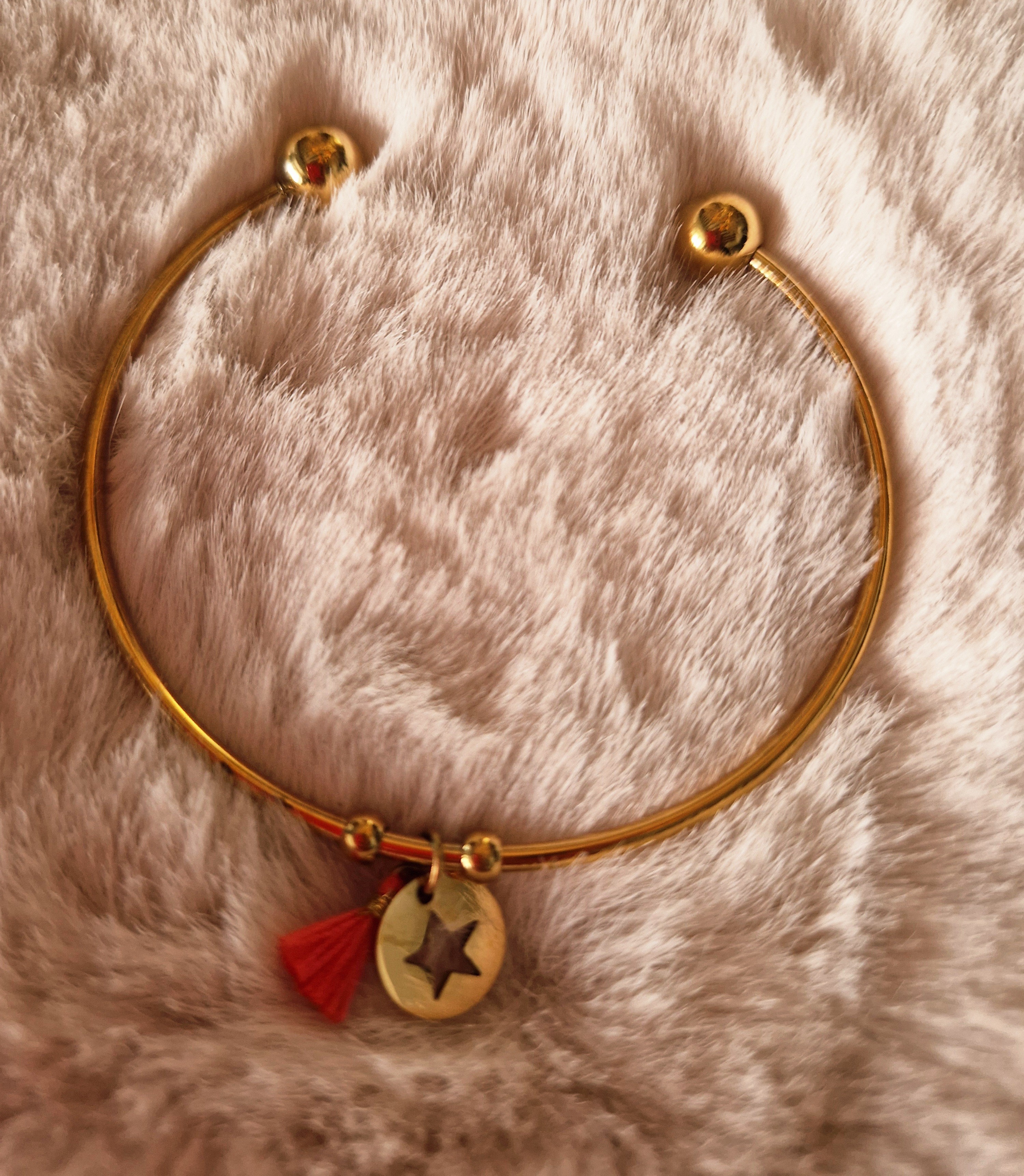 bracelet jonc acier inoxydable avec breloque et pompon ,