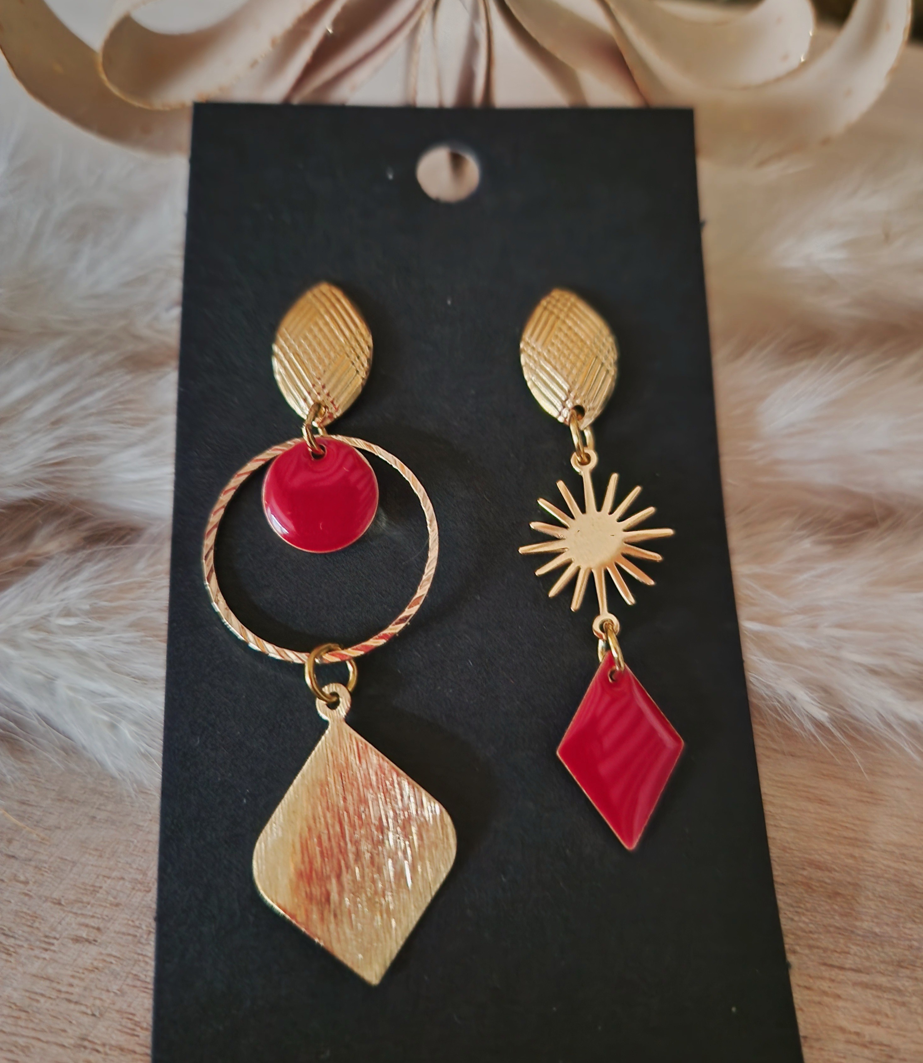 Boucles d'oreilles sunset rouge dépareillée version doré