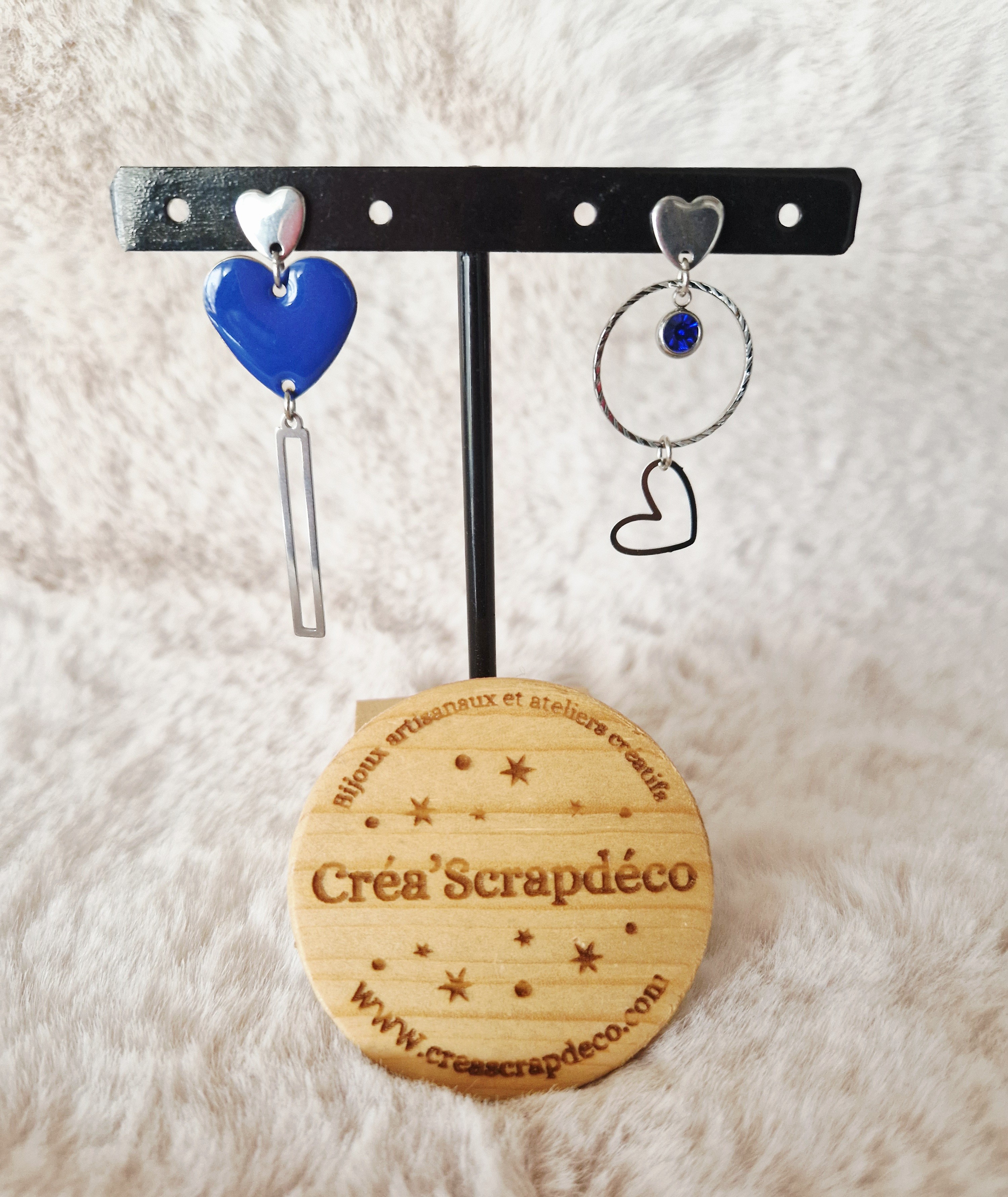 Boucles d'oreilles Love bleu dépareillée version argenté