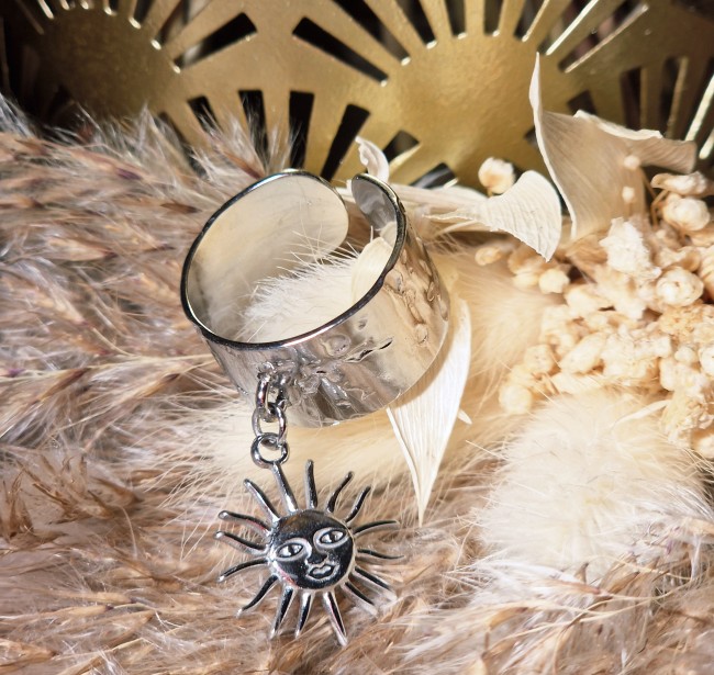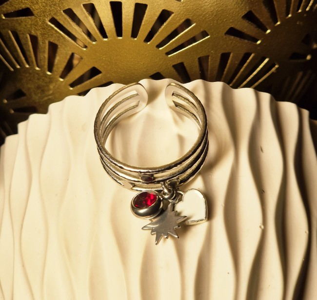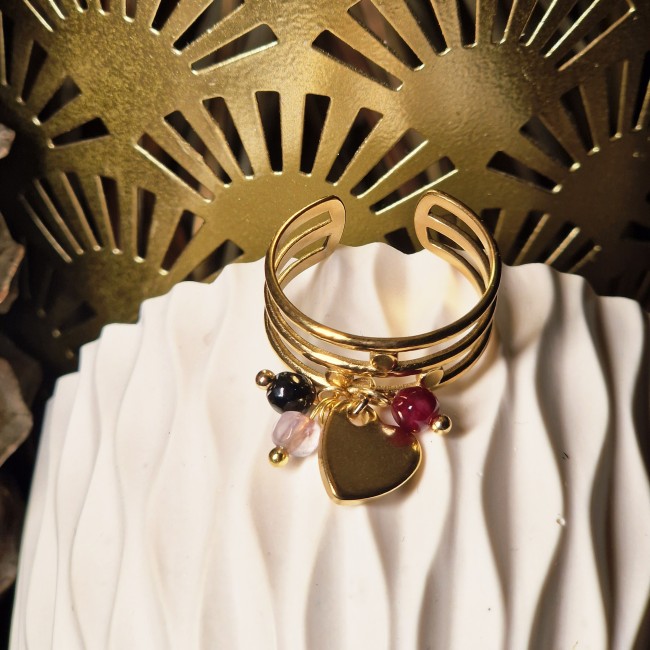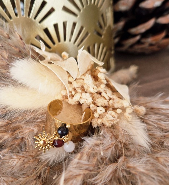 Bague large acier inoxydable soleil perlé doré noir et rouge