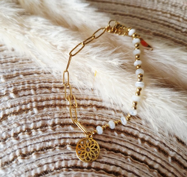bracelet perlé fleur de vie banche acier inoxydable doré